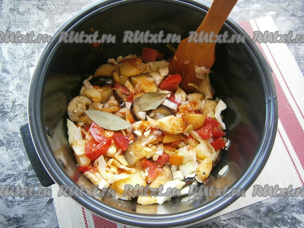 Перемешать, закрыть крышку мультиварки и выставить программу "Тушение" на 45 минут.