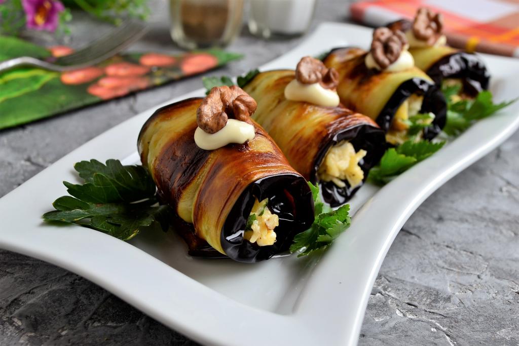 Выложить очень вкусные, ароматные рулетики из баклажанов с сыром, грецкими орехами и чесноком на блюдо, украсить и можно подавать к столу. Эта отличная закуска своим прекрасным вкусом украсит и будни, и праздники!