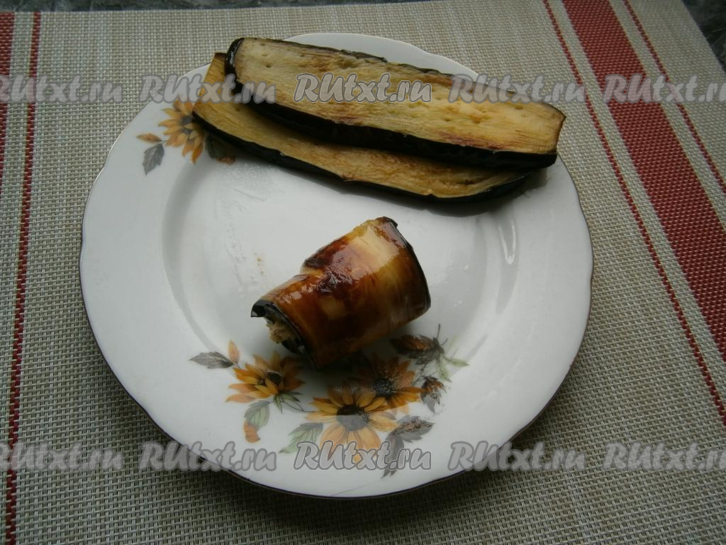 И далее каждую часть баклажана с начинкой свернуть в рулетик. Аналогично сформировать все рулетики.