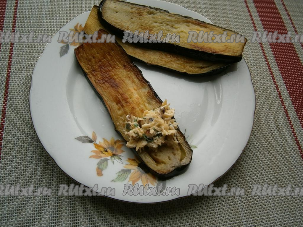 На край каждой обжаренной части баклажанов разместить по 1 чайной ложке начинки.