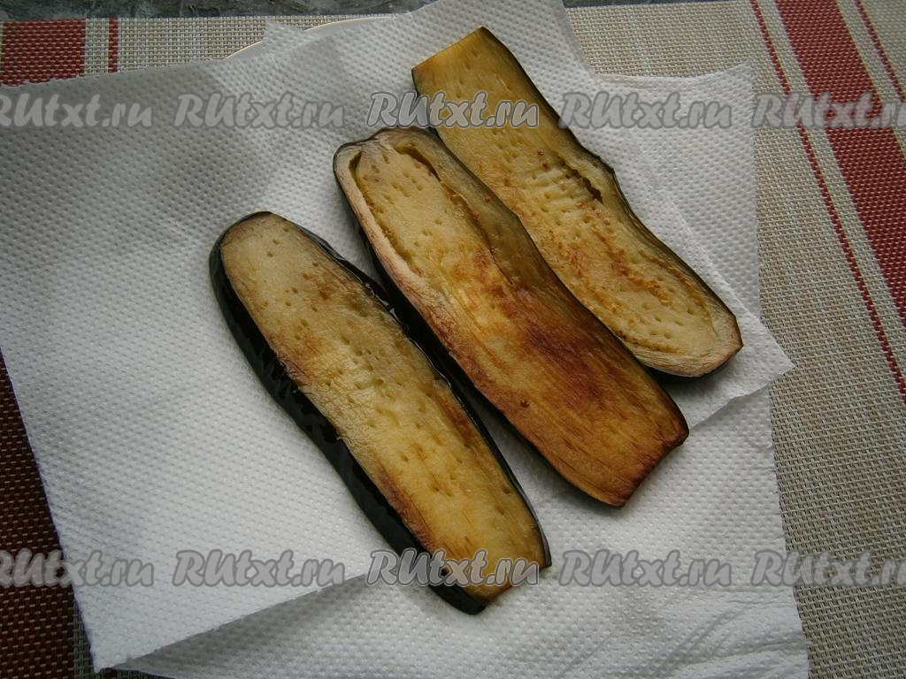 На сковороде разогреть достаточное количество растительного масла, выложить обсушенные баклажаны и обжарить на среднем огне до румяности с двух сторон и мягкости (для этого понадобится 3-5 минут). Обжаренные баклажаны выложить на бумажное полотенце для удаления лишнего жира.