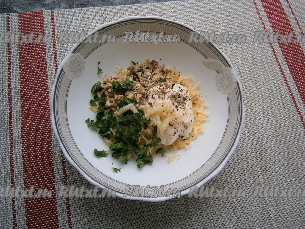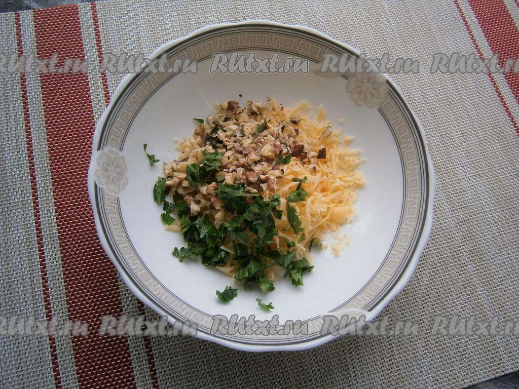 В отдельной тарелке соединить натёртый на мелкой тёрке сыр, мелко нарезанную петрушку и измельчённые орехи.