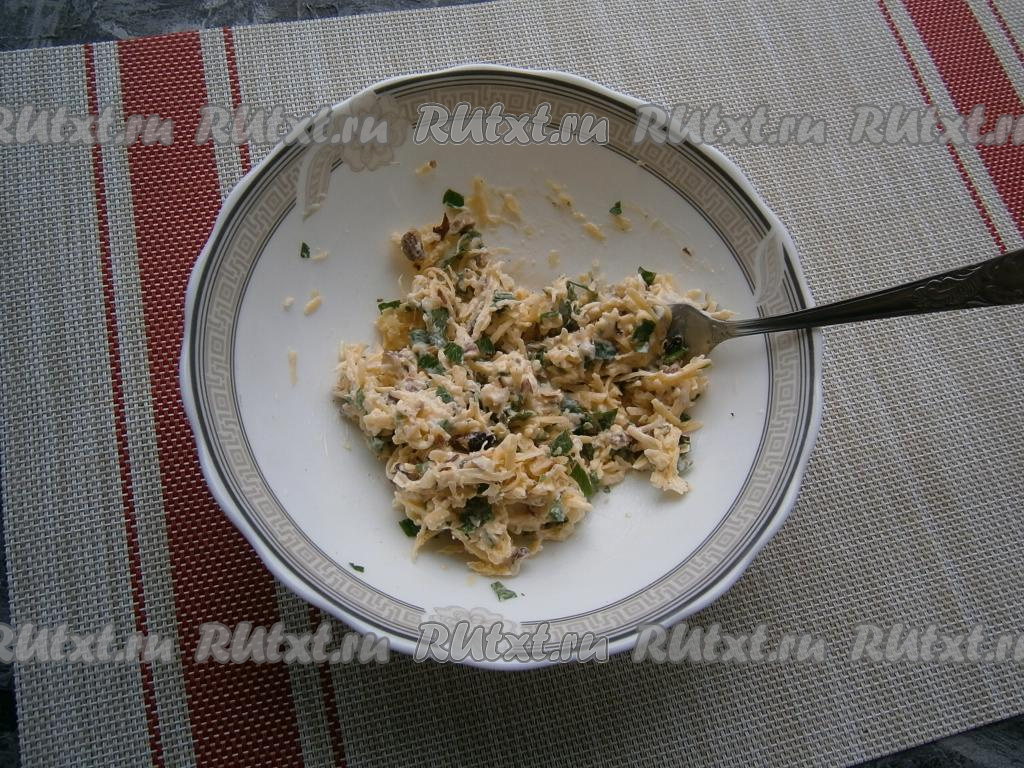Перемешать смесь сыра, зелени, грецких орехов, майонеза, чеснока и начинка для рулетиков из баклажанов готова.
