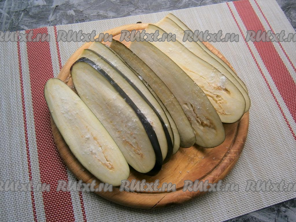 Каждый баклажан нарезать вдоль на 5-6 частей, посолить и оставить минут на 15.
