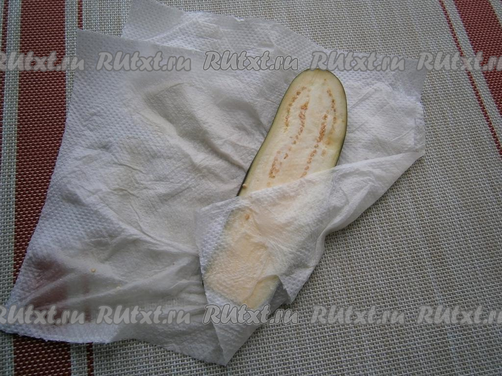 Затем промыть нарезанные баклажаны и тщательно обсушить бумажным полотенцем.