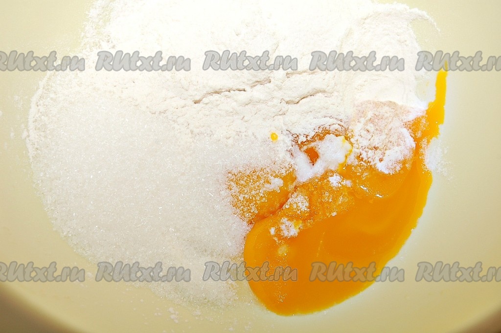 Желтки, сахар и муку взбить отдельно.