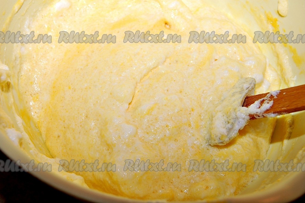 Белки аккуратно добавить к желтково-сахарно-мучной смеси и перемешать лопаткой.