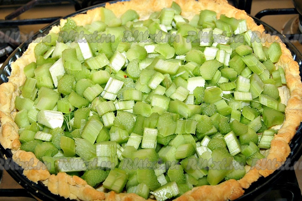 Вытащить из духовки испеченный до полуготовности песочный корж и выложить на него нарезанный ревень, посыпанный сахаром.