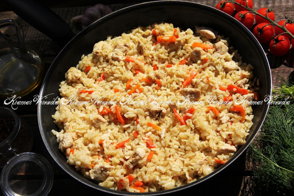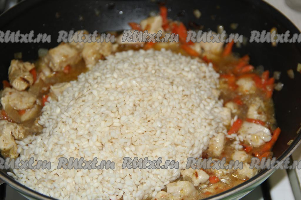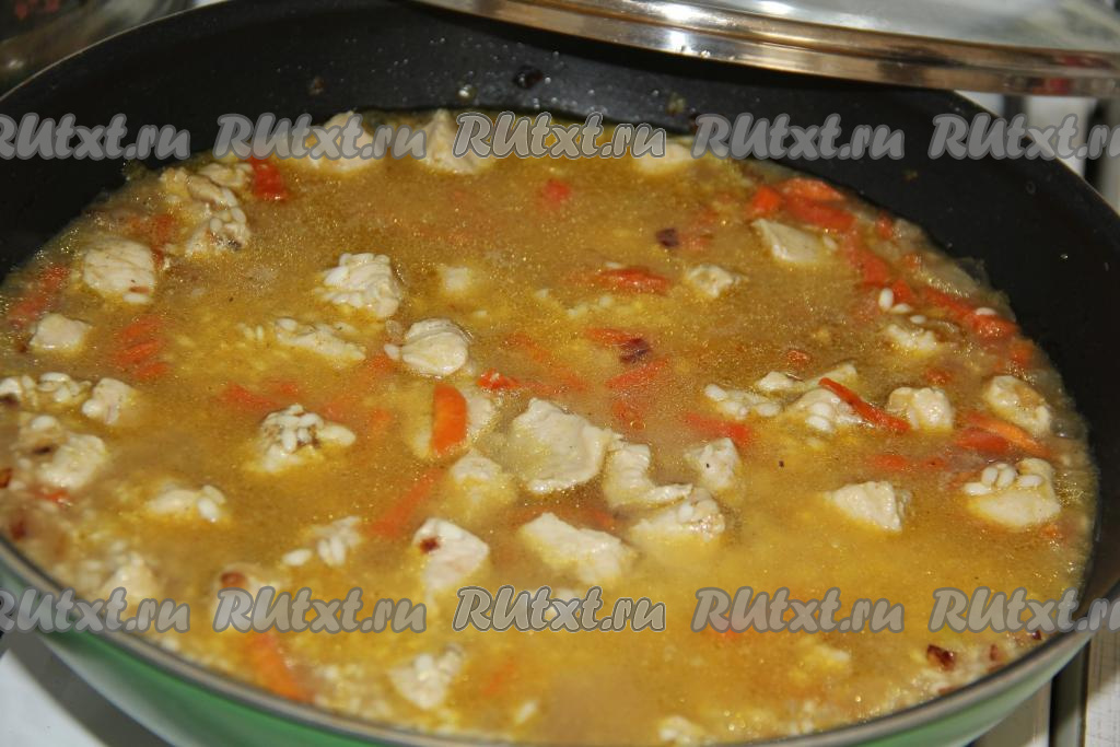 В рис впитается вся вода. Выложить рис в сковороду к овощам, обжаренным с куриной грудкой, перемешать.
