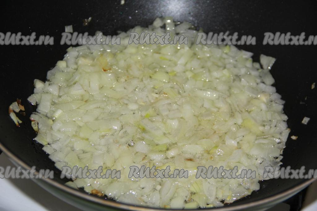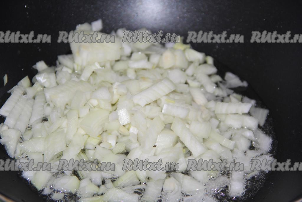 Пока рис пропаривается, приготовить зажарку, для этого сковороду вок (или любую сковороду с высокими бортиками) влить растительное масло, а затем выложить очищенный и мелко нарезанный лук.