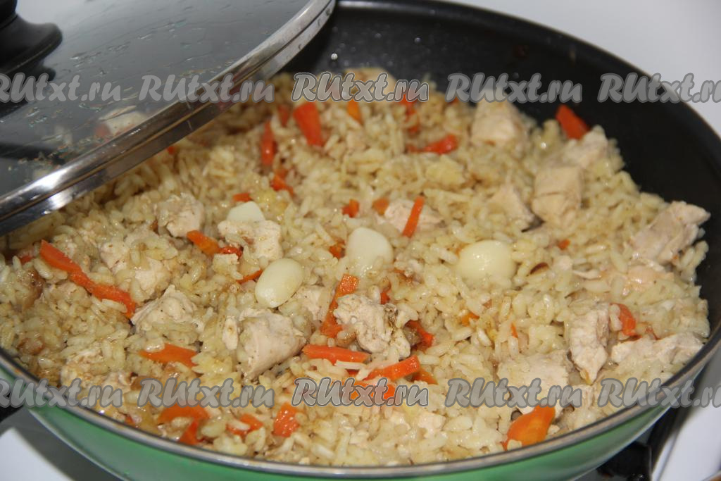 Поверх риса выложить очищенные зубчики чеснока. Накрыть сковороду крышкой. Как только плов с куриной грудкой закипит, убавить огонь до минимума и готовить, примерно, 25 минут. Вода полностью впитается в рис.