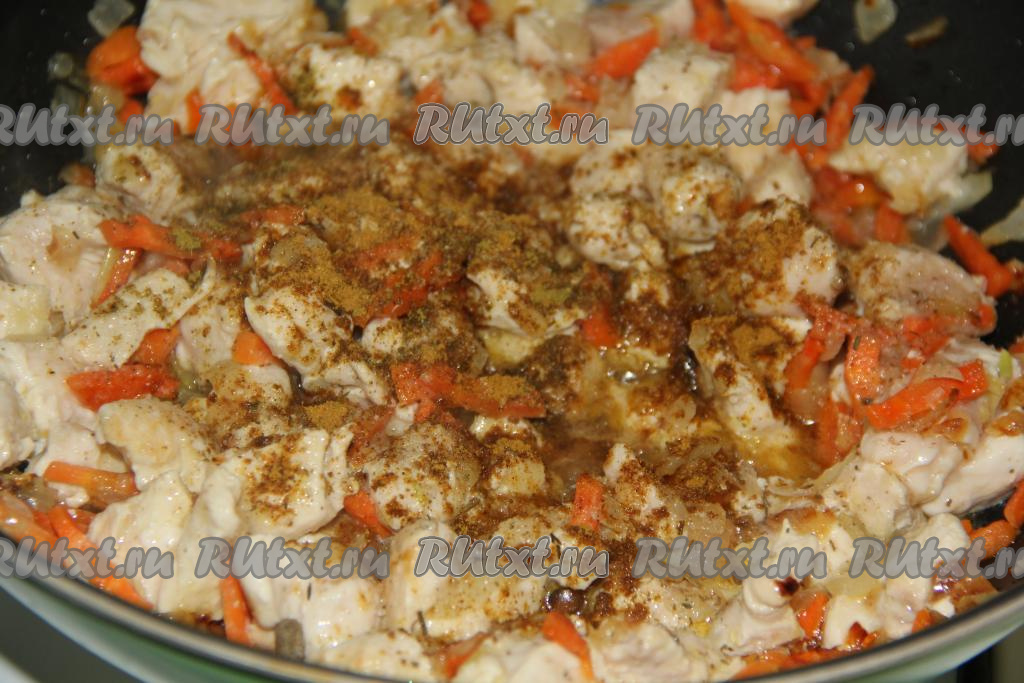 Обжарить куриное мясо с овощами, периодически помешивая, в течение 10 минут под крышкой на среднем огне. Затем посолить, добавить специи и тщательно перемешать.