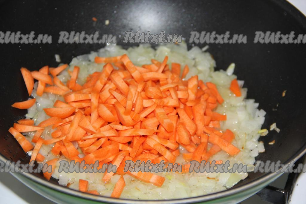 Морковку очистить, нарезать брусочками и добавить в сковороду к обжаренному луку.