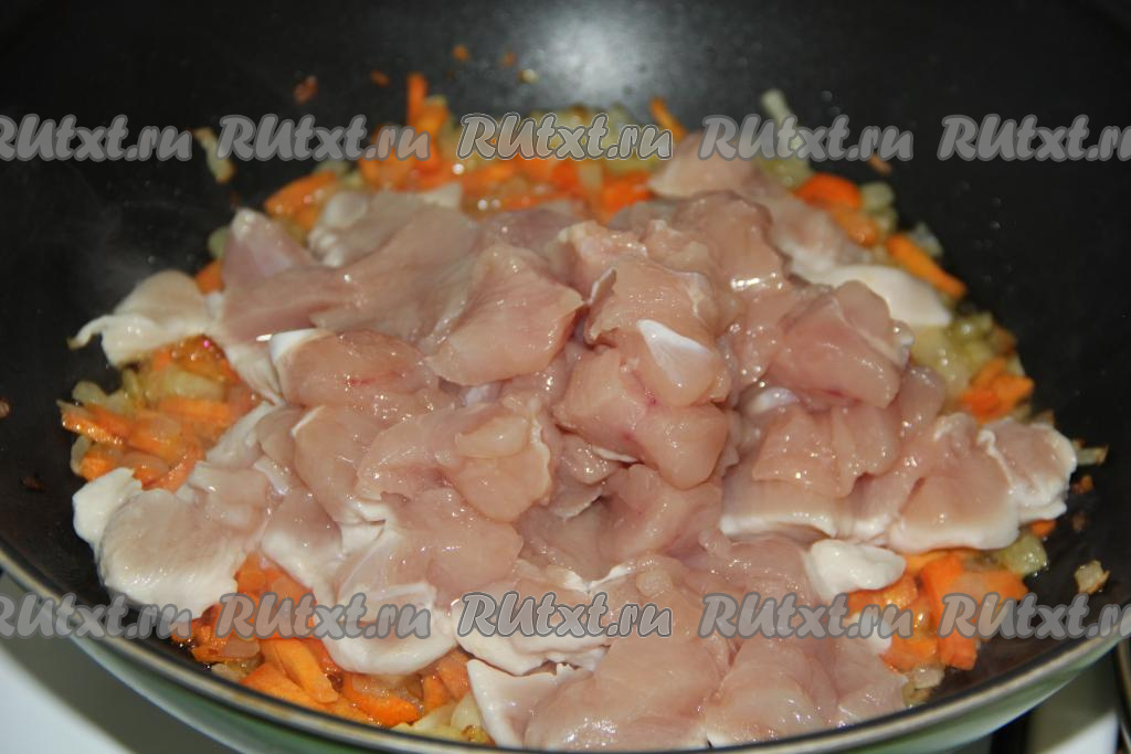 Куриную грудку нарезать на кубики и выложить в сковороду к обжаренным овощам.