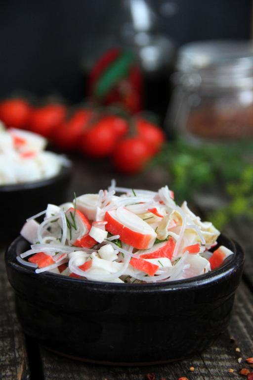Хочу предложить рецепт салата с фунчозой и крабовыми палочками под названием "Лакомка". Блюдо получается очень нежным и вкусным. Такой салатик можно приготовить на ужин или в качестве лёгкого перекуса. Уверена, это блюдо многим придётся по вкусу!