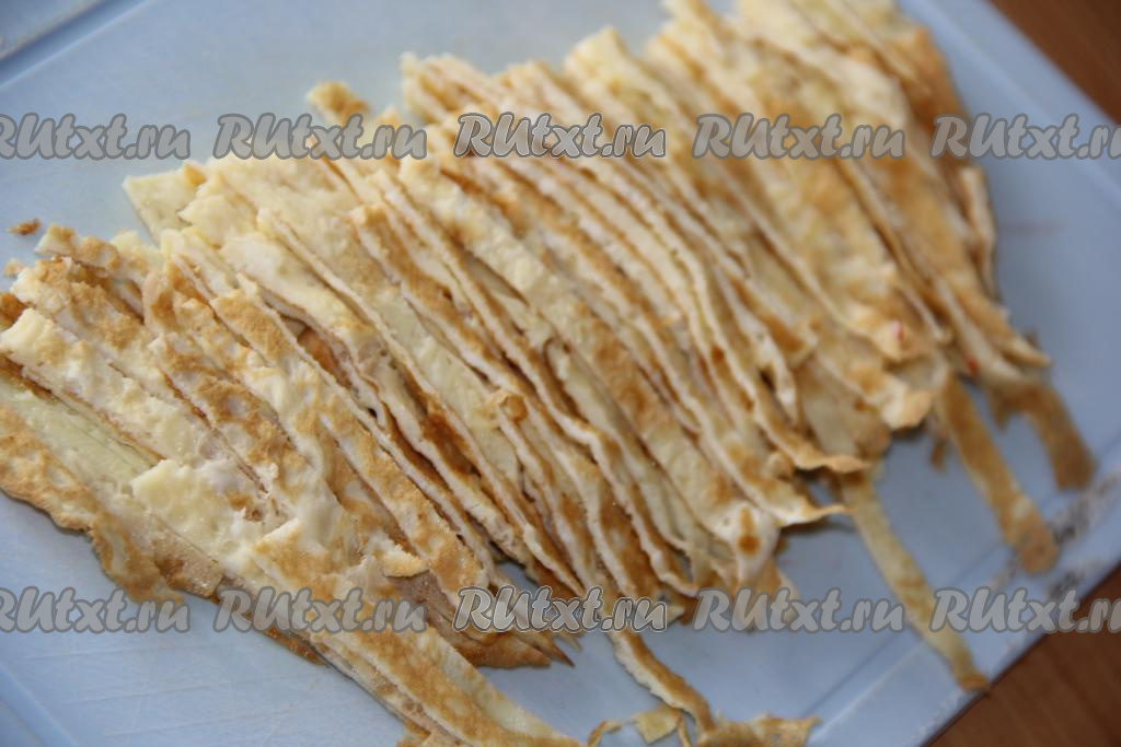 Нарезать охлаждённые яичные блинчики на полоски шириной 0,5 см.