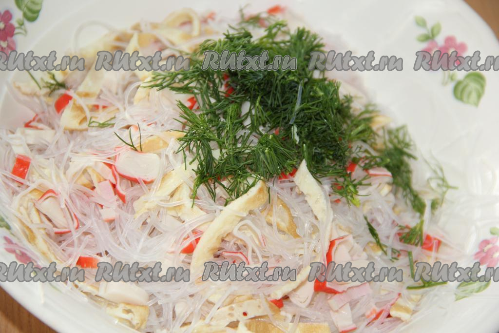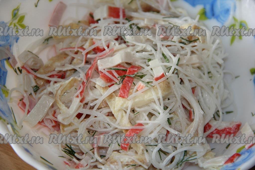 Фунчозу нарезать на кусочки длиной, примерно, 5-6 см и добавить в салат из крабовых палочек и блинчиков.