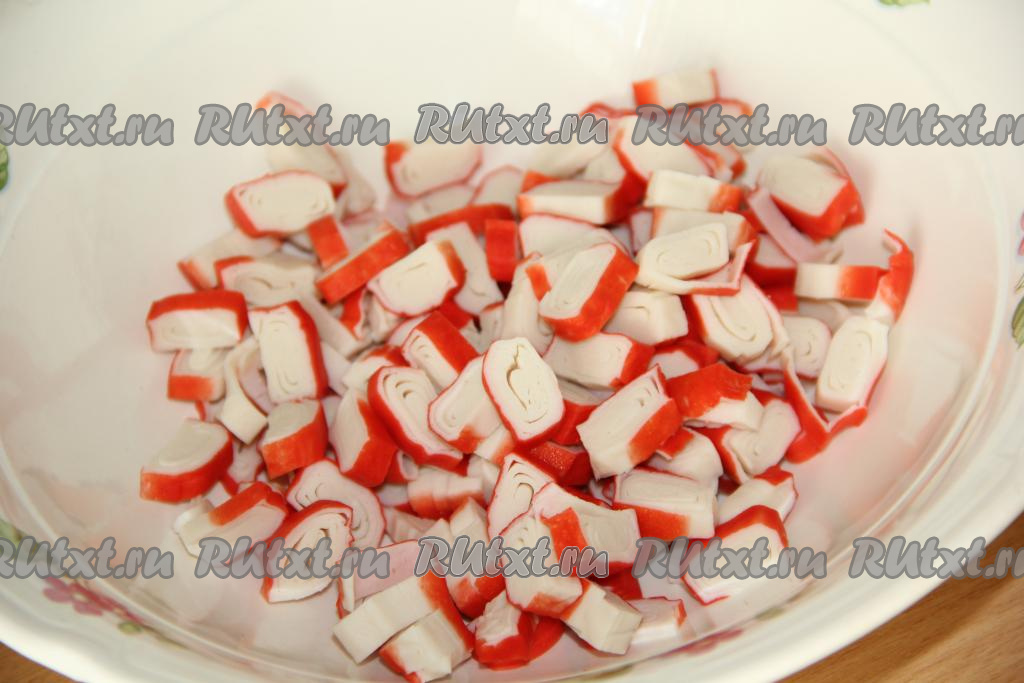 Крабовые палочки нарезать на кусочки толщиной 0,5 см.
