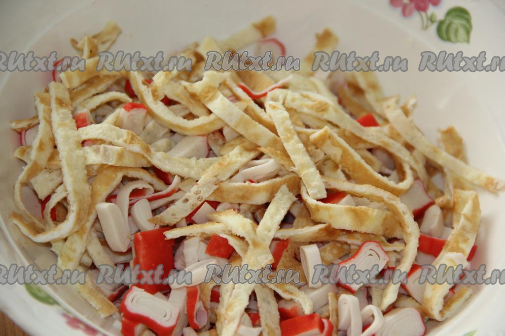 Соединить нарезанные крабовые палочки и яичные блинчики.
