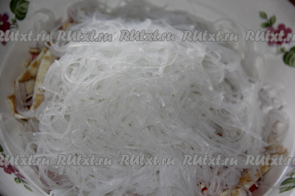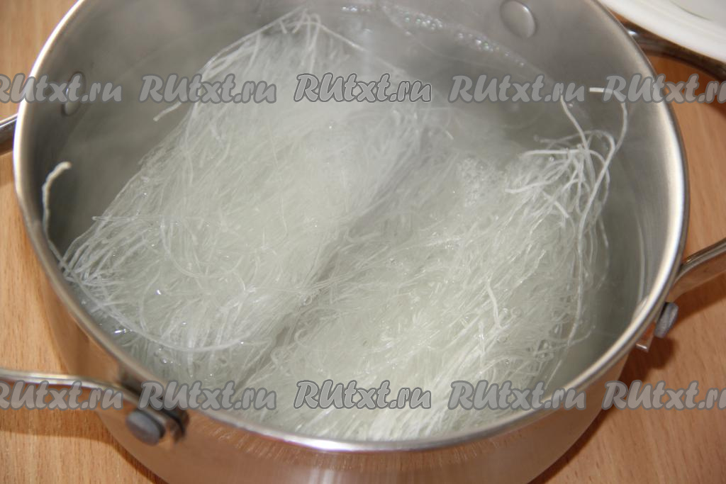 Залить фунчозу кипятком и оставить минут на 5.