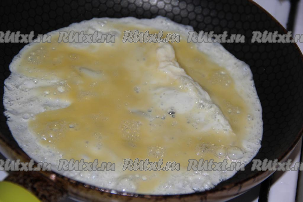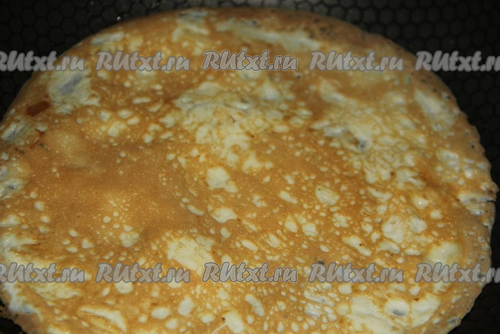 На разогретую сковороду влить 1/2 яичной массы (если сковорода без антипригарного покрытия, её можно немного смазать растительным маслом), жарить блинчик на среднем огне до золотистого цвета с одной стороны.