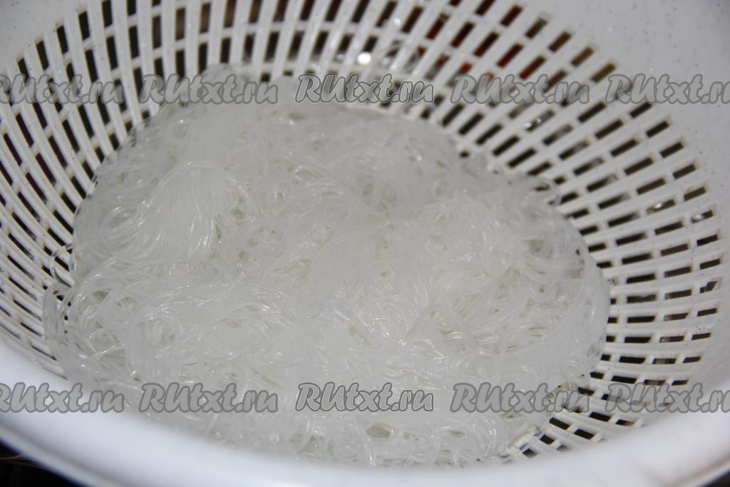 По прошествии времени фунчозу откинуть на дуршлаг, затем промыть холодной водой, дать полностью стечь воде.