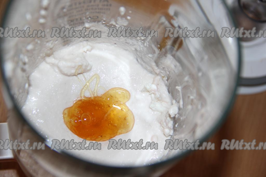 Пробить массу погружным блендером до однородного и гладкого состояния. Добавить мёд и ещё раз пробить блендером.
