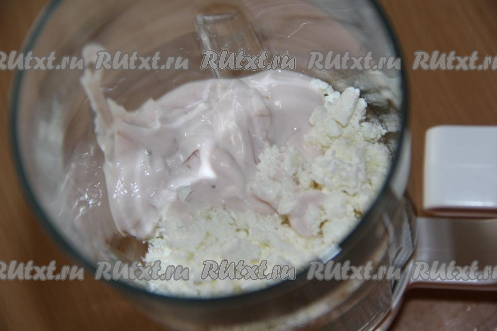В чаше блендера соединить творог любой жирности и сметану (или йогурт). Я использовала ягодный йогурт.