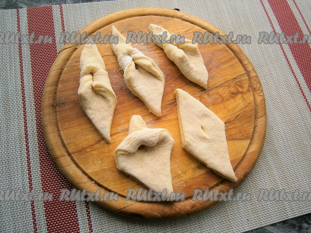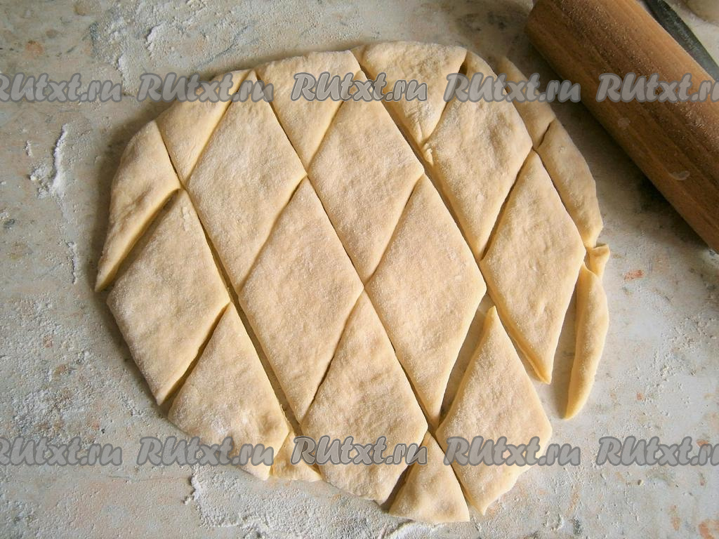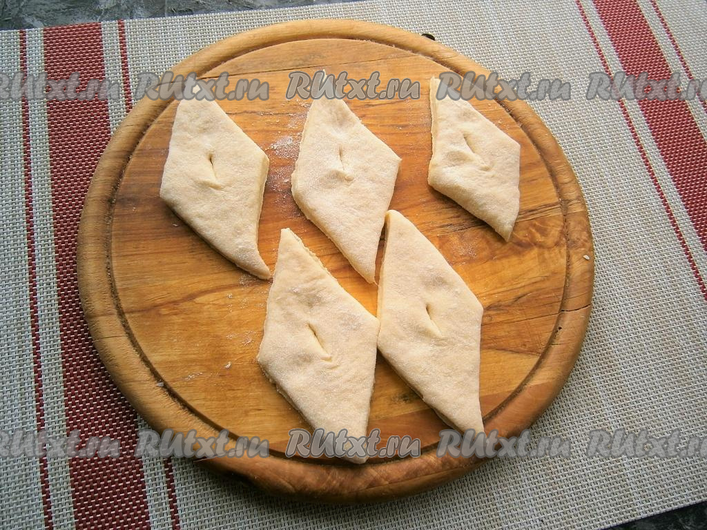 По прошествии времени тесто обмять, разделить на 3-4 части. Каждую часть теста раскатать в пласт (или лепёшку) толщиной около 1 см. Нарезать тесто ромбами.