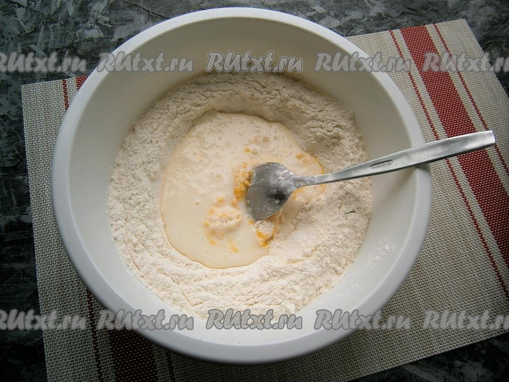Вливая в мучную смесь частями смесь кефира и соды, замешивать тесто вначале ложкой.