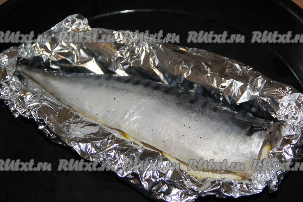 Выложить скумбрию в жаропрочную форму на фольгу, сформировать из фольги бортики, чтобы не вытекал сок в процессе запекания.