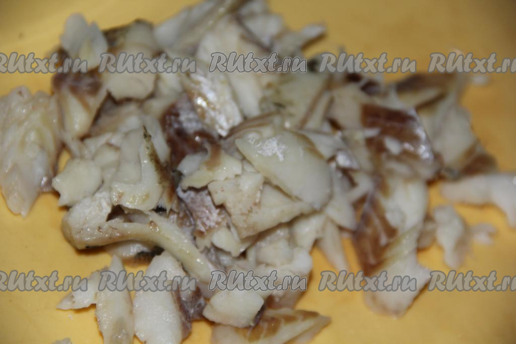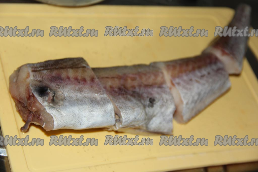 Тушку минтая промыть под проточной водой, если рыба не потрошёная, тогда голову и хвост нужно отрезать, а внутренности удалить. Разрезать рыбу на 3-4 части.