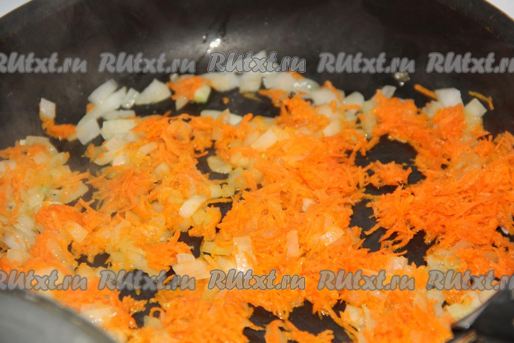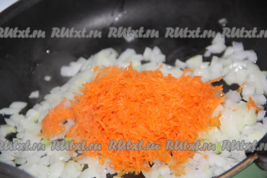 Когда лук обжарится, добавить к нему морковь, натёртую на средней (или крупной) тёрке.