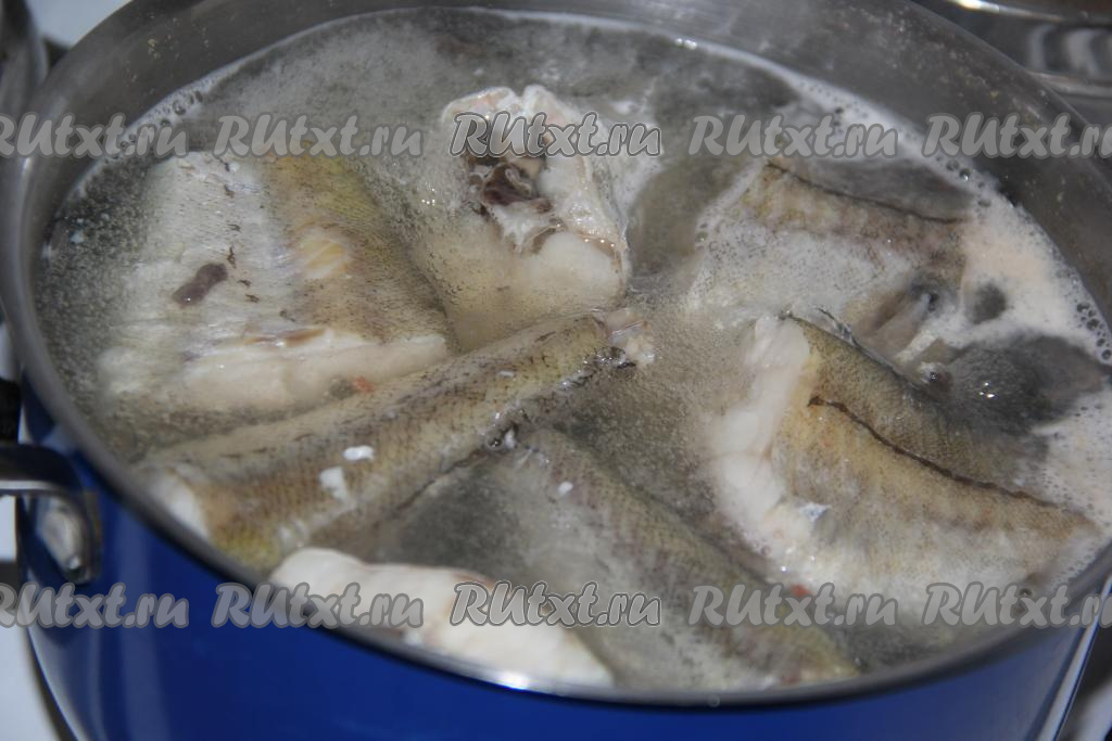 Выложить кусочки минтая в кастрюлю и залить, примерно, 2,5 литрами воды, отправить на огонь. Бульон довести до кипения, снять пену, уменьшить огонь и варить рыбу, примерно, 20 минут.