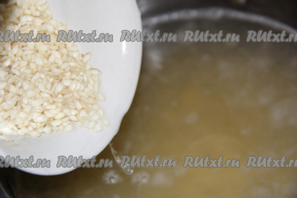 Рис хорошо промыть и добавить в рыбный суп, варить минут 15 с момента закипания на небольшом огне.