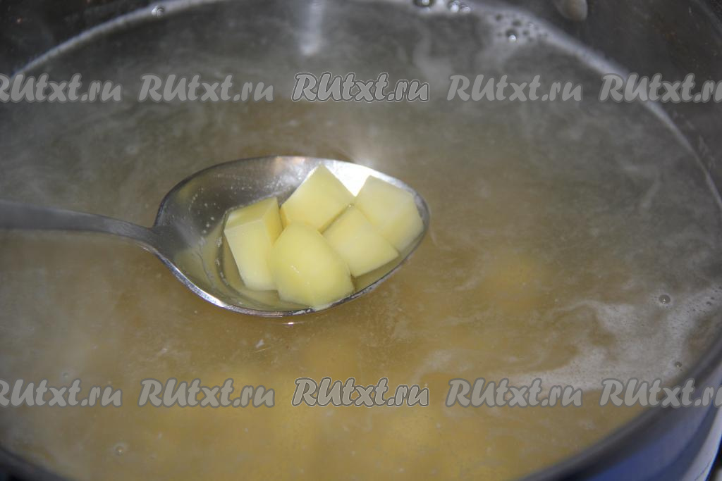 Рыбный бульон процедить и довести до кипения, затем добавить нарезанный картофель и варёное филе минтая.