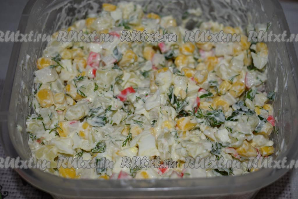 После заправки майонезом перемешиваем крабовый салат и пробуем его на соль (так как майонез бывает солёный, то подсаливать салат надо не до заправки, а уже после, чтобы не пересолить!). Далее готовый салат отправляем в холодильник на 2 часа.