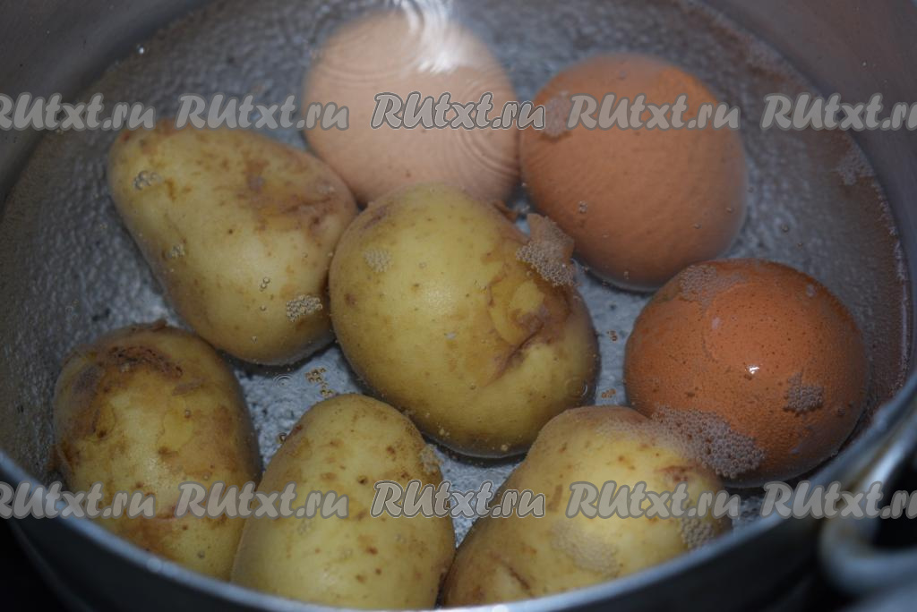 Картофель в мундире и яйца нужно отварить до готовности, для этого вымытые яйца и картошку отправляем в кастрюлю с холодной водой, ставим на огонь, с момента закипания варим на небольшом огне яйца 10 минут, а картофель - до готовности (примерно, 20 минут). Готовность картофеля проверяем, прокалывая клубни ножом (если нож легко прокалывает картофелину - значит готова).