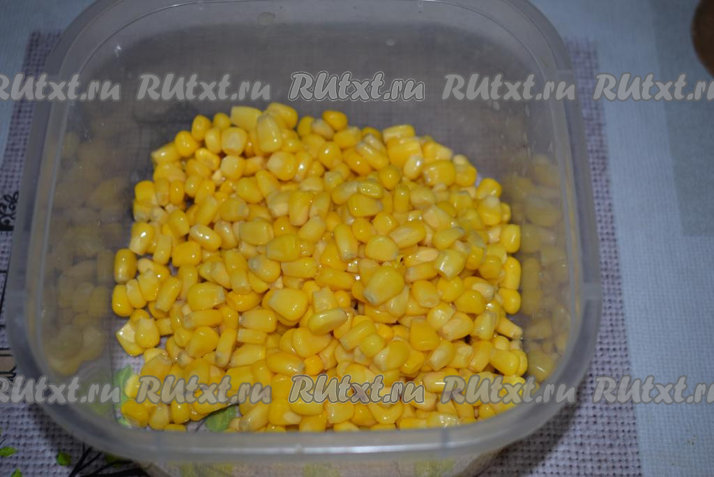 Баночку консервированной кукурузой открываем и сливаем из неё жидкость. Высыпаем кукурузу в миску.