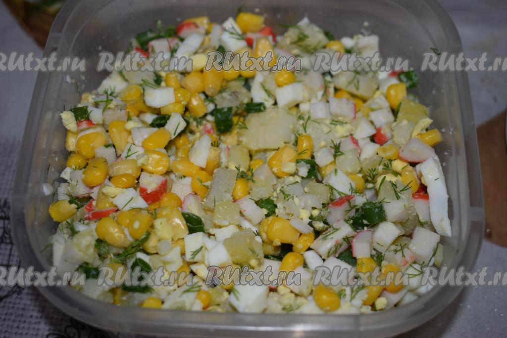 К кукурузе добавляем нарезанные картошку, крабовые палочки, зелёный лук, зелень, яйца и перемешиваем.