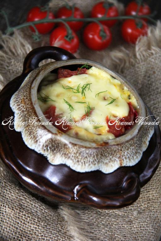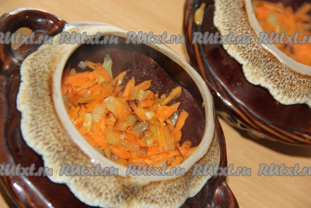 Выложить обжаренные овощи на дно горшочков. Я готовила в 4 горшочках.