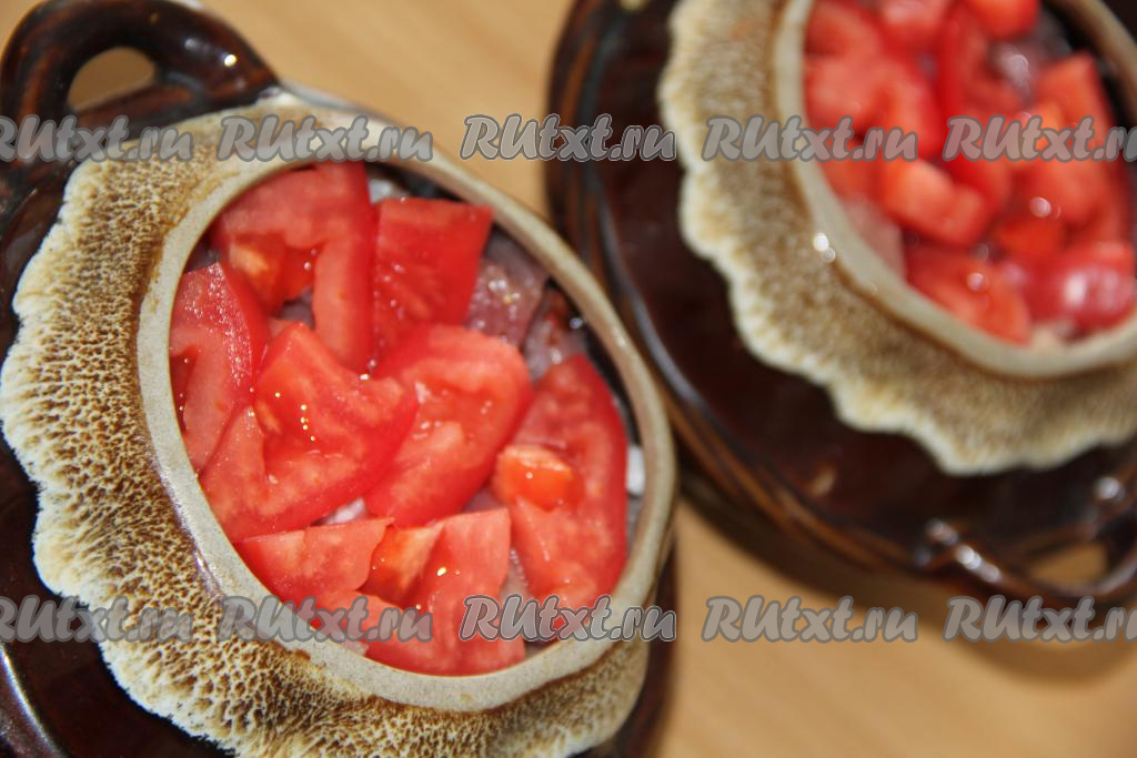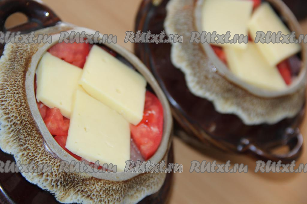 Поверх помидоров выложить пару долек сыра. Добавить в каждый горшочек по 100 мл воды (вместо воды можно влить мясной или овощной бульон).