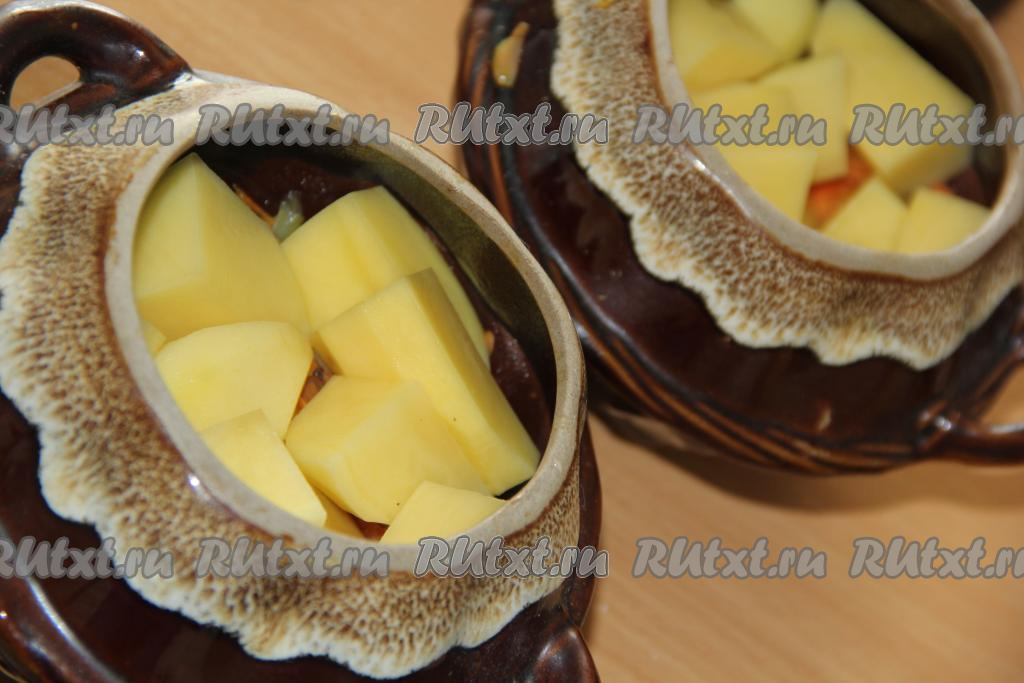 Картофель очистить, крупно нарезать и разложить по горшочкам.