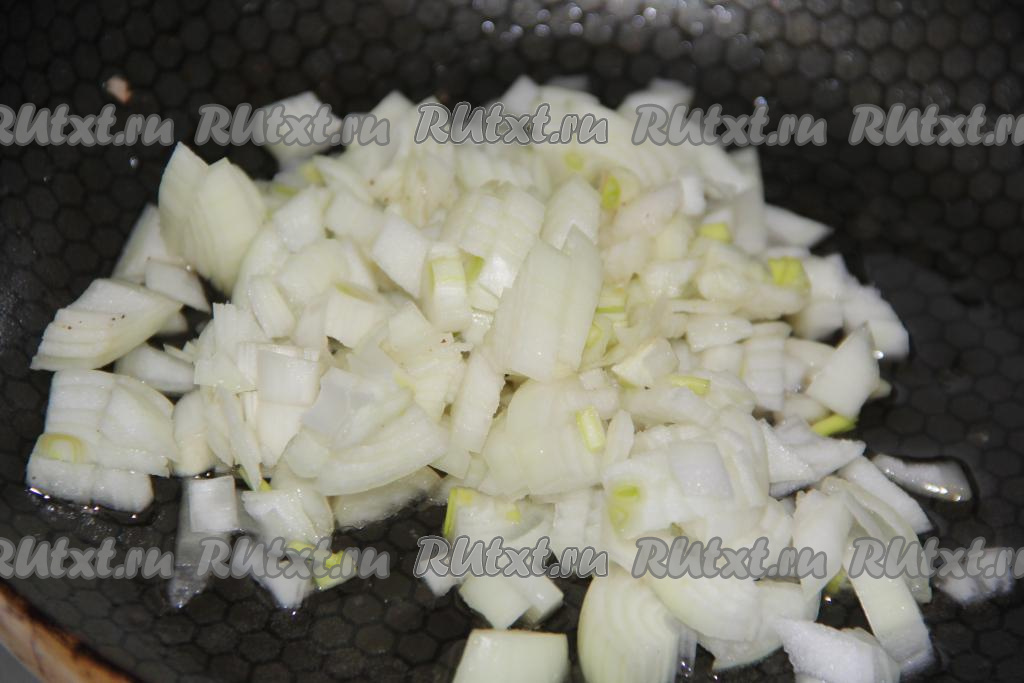 Морковь и лук очистить. В сковороду налить немного масла, выложить мелко нарезанный лук и обжарить, периодически помешивая, до золотистого цвета.