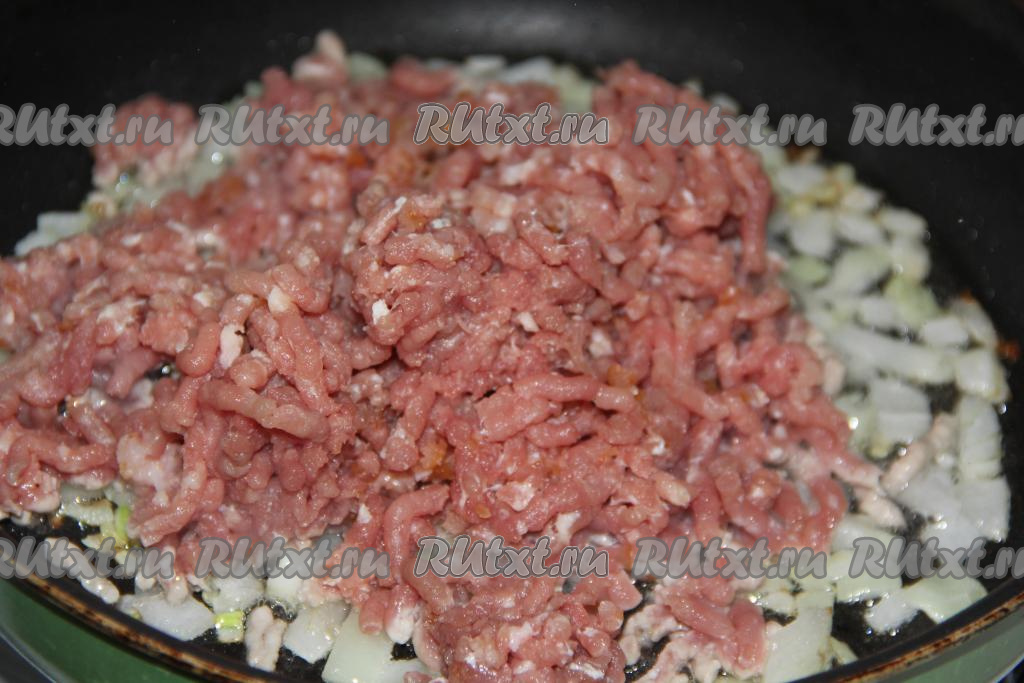 Когда обжарится лук, выложить в сковороду фарш.