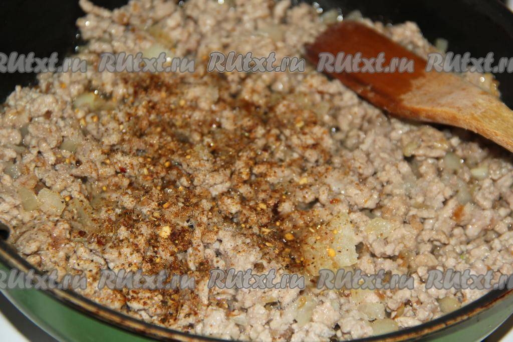 Фарш с луком обжаривать минут 10 на среднем огне, тщательно разбивая комочки. В конце жарки посолить, добавить специи по вкусу, перемешать, снять с огня и дать немного остыть.