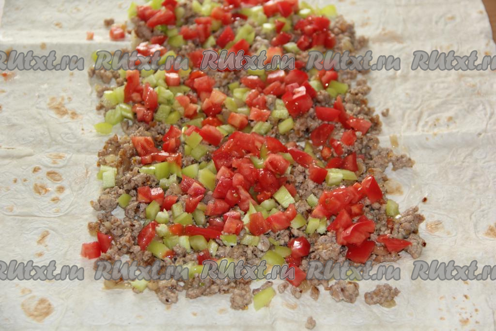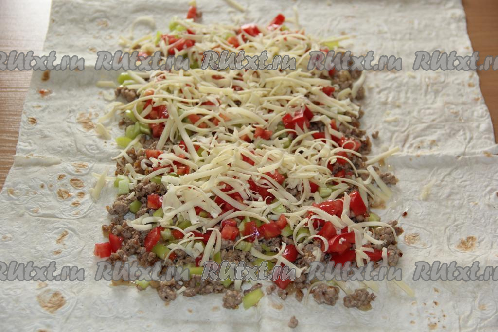 Сыр натереть на крупной тёрке и выложить поверх начинки (немного сыра отложите в сторону, он понадобится в дальнейшем для посыпки лаваша).