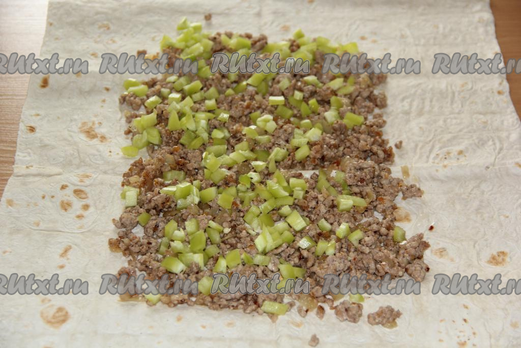 Поверх лаваша выложить мелко нарезанный болгарский перец.