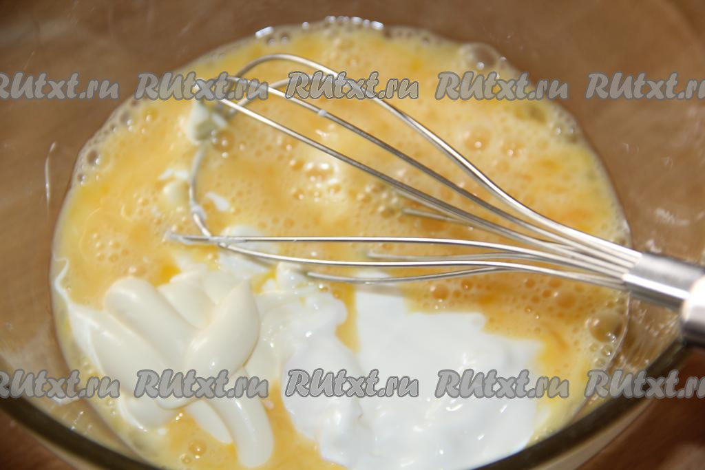 Сметану и майонез добавить к яйцам, слегка посолить и перемешать венчиком до однородного состояния.