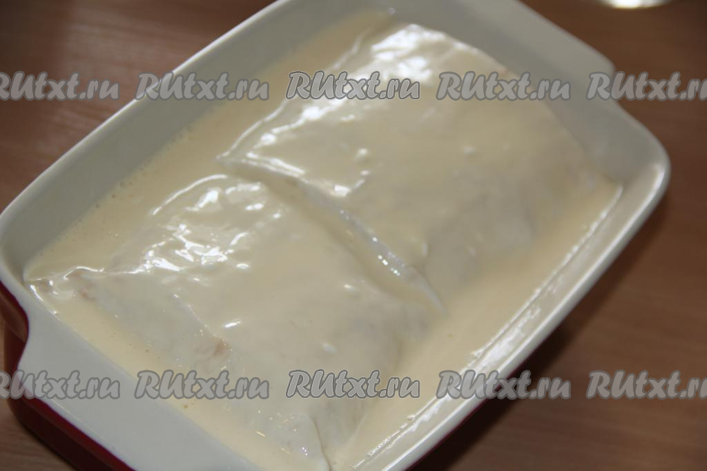 Вылить заливку поверх рулета из лаваша.